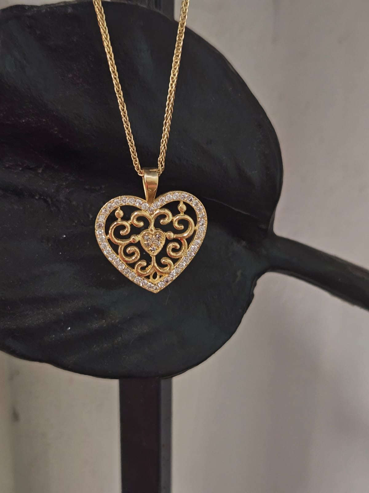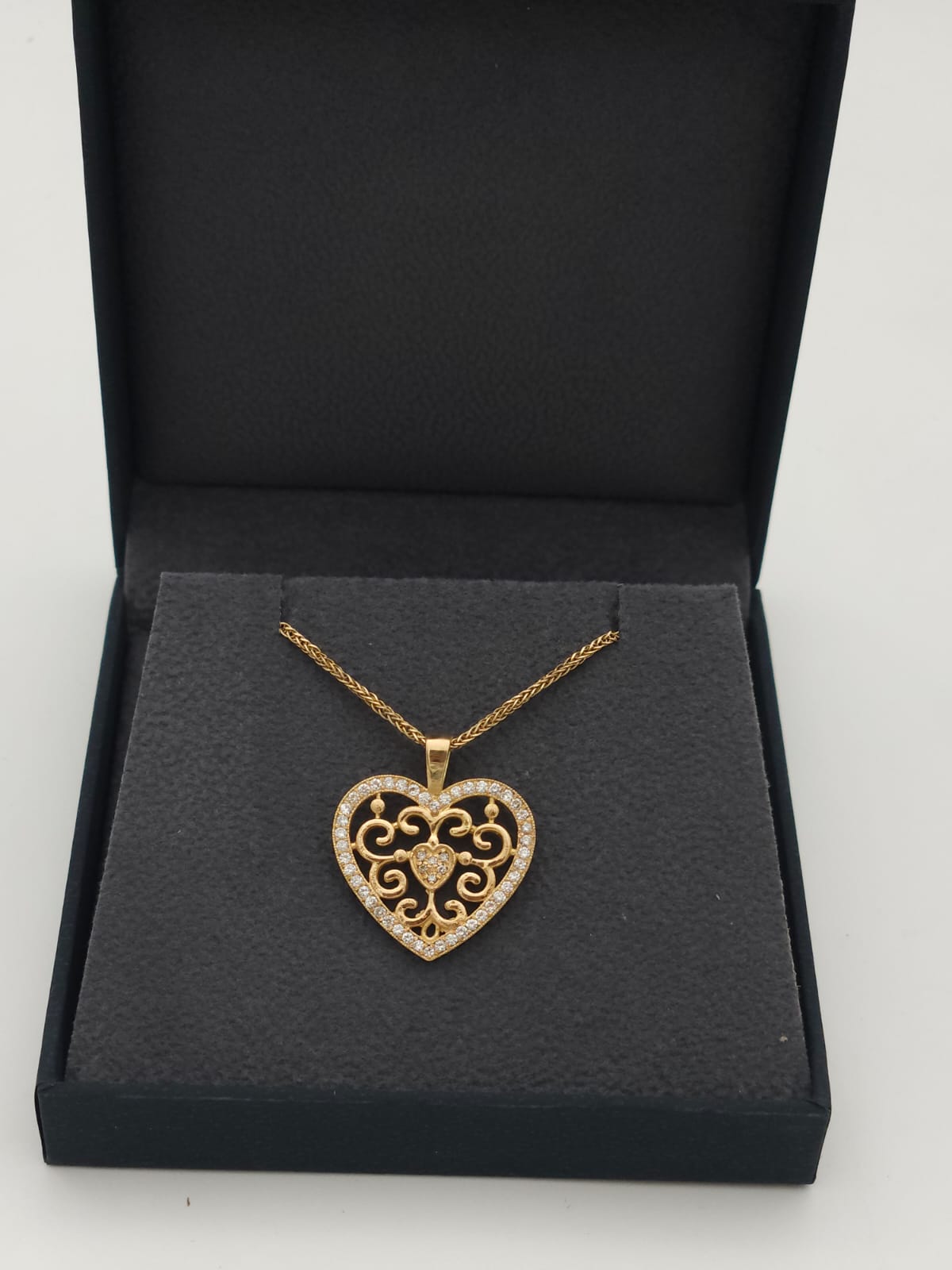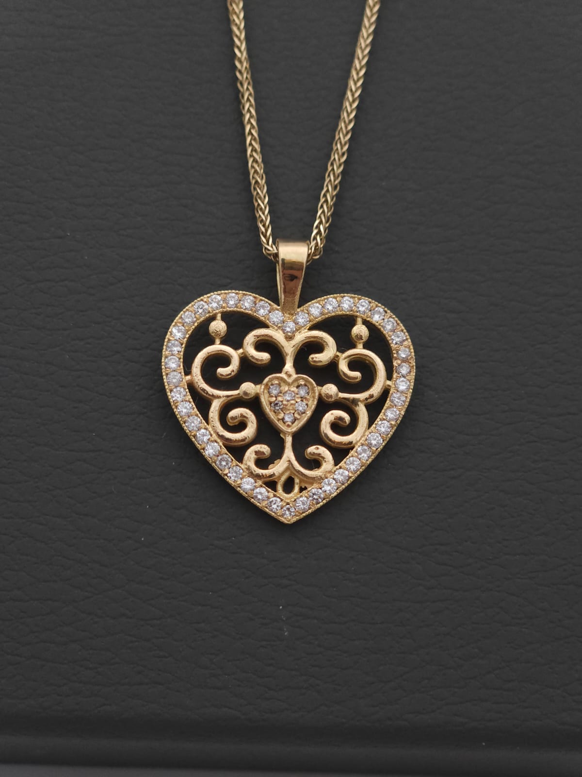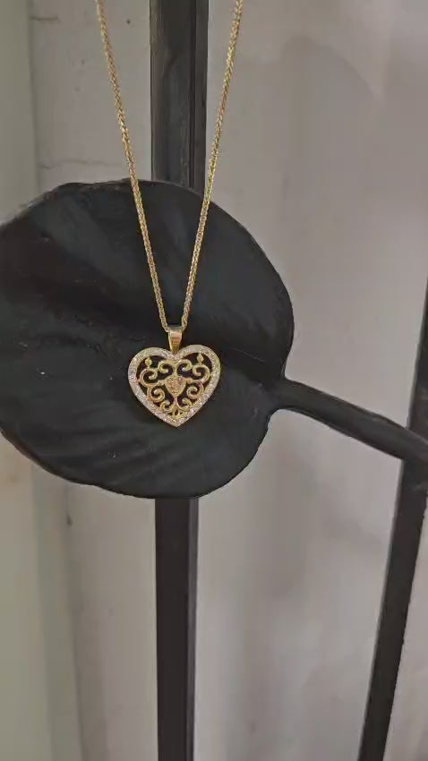 תליון לב מזהב בעבודת יד, מעוטר בעיטורים פתוחים בסגנון קלאסי-רומנטי. המסגרת כולה משובצת  ביהלומים קטנים שמוסיפים ברק ועדינות, ובמרכז לב קטן מלא באבנים יהלום מנצנצות. תליון שמבטא אהבה, יוקרה ואלגנטיות – מתנה מושלמת לאהוב/ה או לעצמך.
